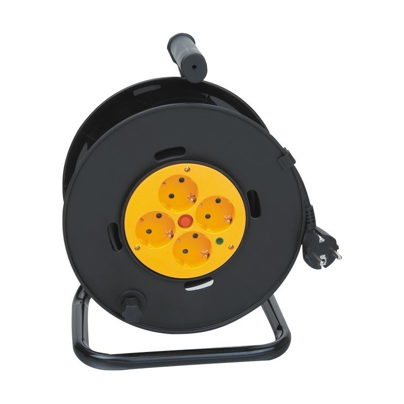 Carrete alargador de cable de tipo H05VV-F y sección 3x1,5mm² con una toma de corriente extensible de 25 metros y 4 enchufes del tipo German Socket.Desenrrollado soporta una carga máxima de 3.500W Vatios mientras que la carga máxima con el cable enrollado es de 1.000W.