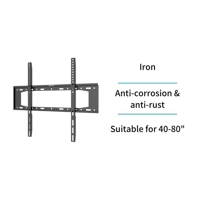 | Especificaciones del Soporte Fijo para TV Función del producto: Soporte fijo para colgar la televisión Material principal: hierro Protección: Anti corrosión, Anti oxidante Carga máxima: Hasta 65Kg Talla (Aplicabilidad): 40-80 pulgadas |